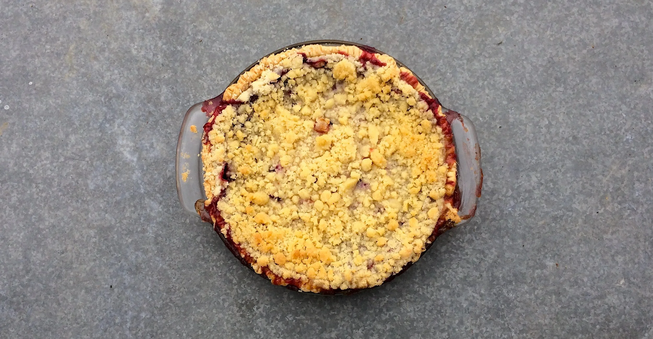 Diana says her pie has never been done in 40 minutes, but she starts checking it then and every 5 minutes after until it's done. You're looking for the streusel to turn a pale golden color and the filling to be bubbled up around the edges.